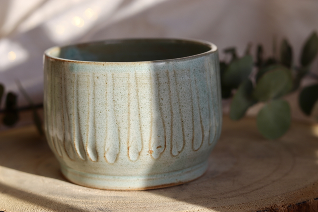 Petit bol en céramique réalisé au tour de potier dans mon atelier. Je l’ai ensuite texturé avant de le cuire une première fois à 980°. Puis je l’ai émaillé d’un émail bleu vert pour ensuite le mettre au four pour sa deuxième cuisson à 1250°.