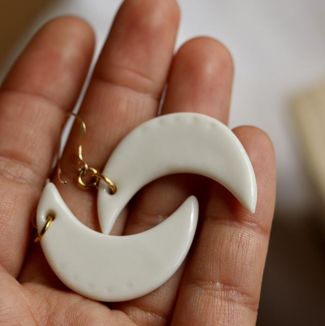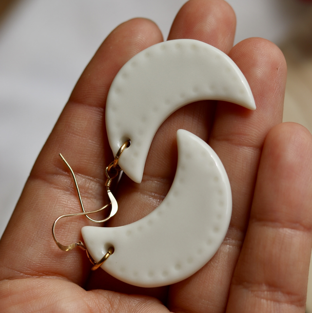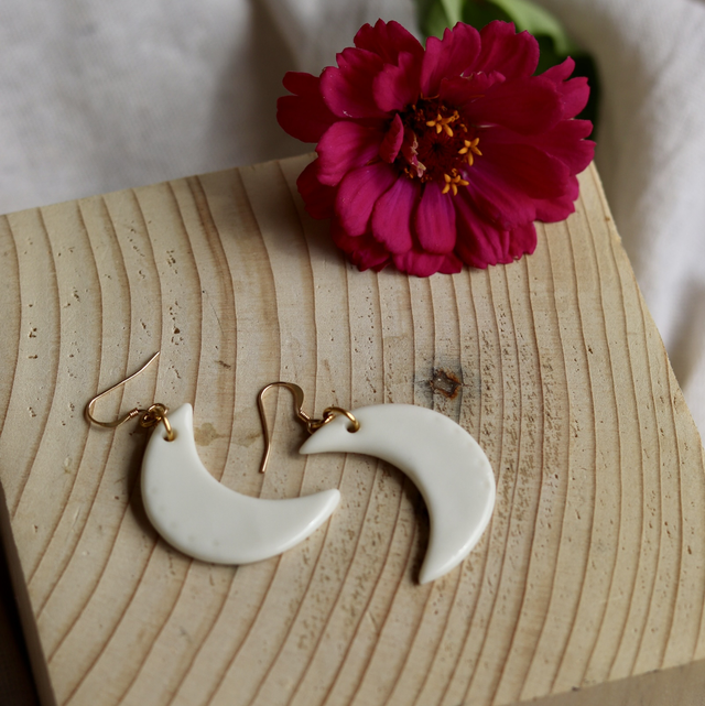 Jolie paire de boucles d’oreilles en porcelaine en forme de lune et légèrement martelées.