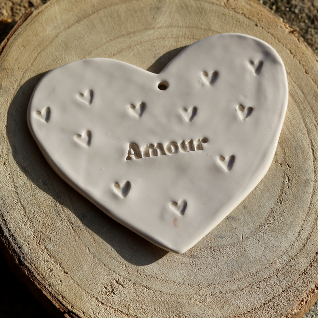 Cœur à suspendre en faïence avec inscription « AMOUR »