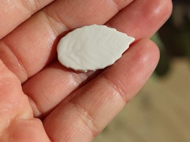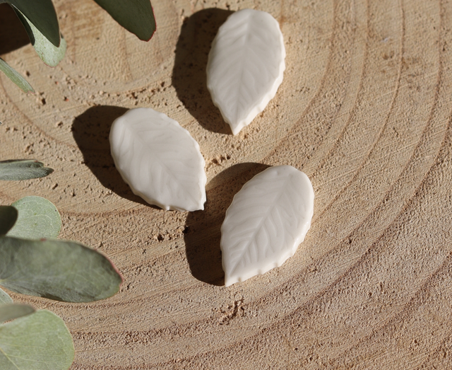 Fèves réalisées en porcelaine en forme de petites feuilles.