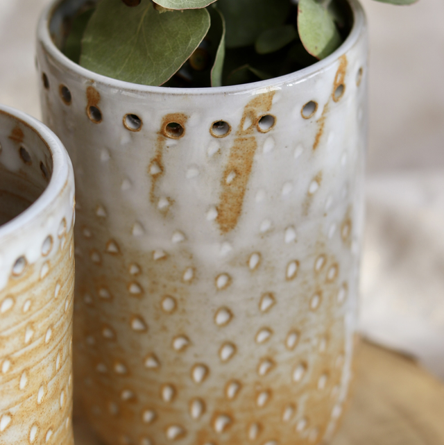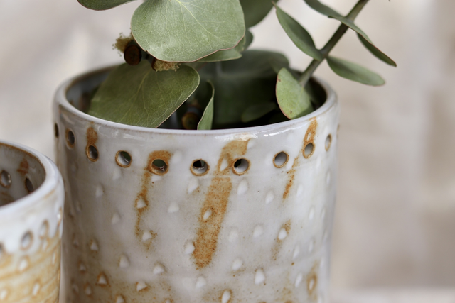 Le vase est texturé de motif et émaillé d'un émail blanc.
